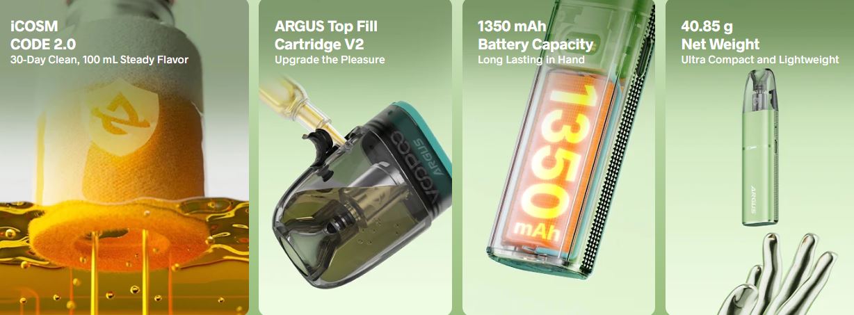 El Kit Argus G3 Mini es compatible con las cartuchos Argus Top-Fill V2 de 2ml o 3ml, que cuentan con la tecnología iCosm Code 2.0, permitiendo una durabilidad de hasta 100ml de uso sin pérdida de sabor. El sistema de rellenado superior facilita una recarga limpia y rápida del e-liquid.