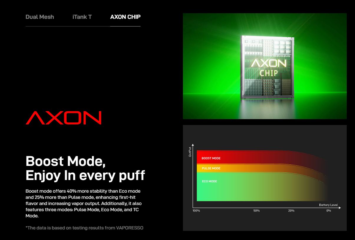 En su interior incorpora el Chip Axon, con modos inteligentes que optimizan cada calada. El modo Boost ofrece un rendimiento un 40% más estable que el modo Eco y un 25% más que el modo Pulse, asegurando máximo sabor desde el primer instante.