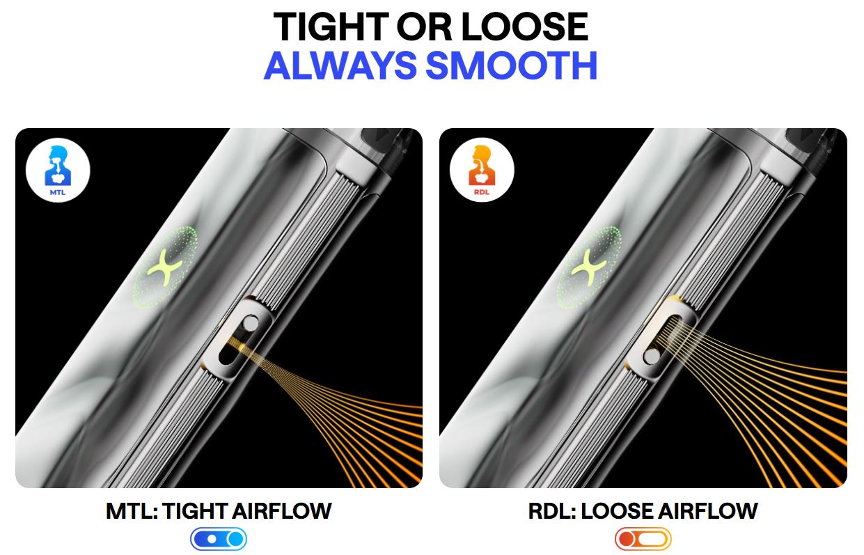 Flujo de aire ajustable Mediante una pestaña lateral, puedes regular la entrada de aire para adaptar el dispositivo a un vapeo MTL o RDL, según tu preferencia.