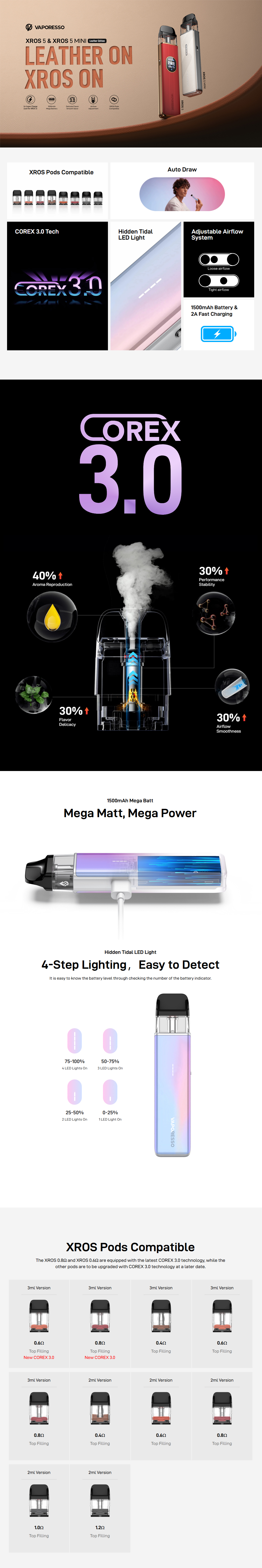El kit Xros 5 Mini cuenta con una batería integrada de 1500mAh y ofrece una potencia máxima de hasta 30W. Este dispositivo es compatible con los cartuchos de la serie Xros Top Fill, que permiten un llenado superior fácil y pueden contener hasta 3mL de líquido.